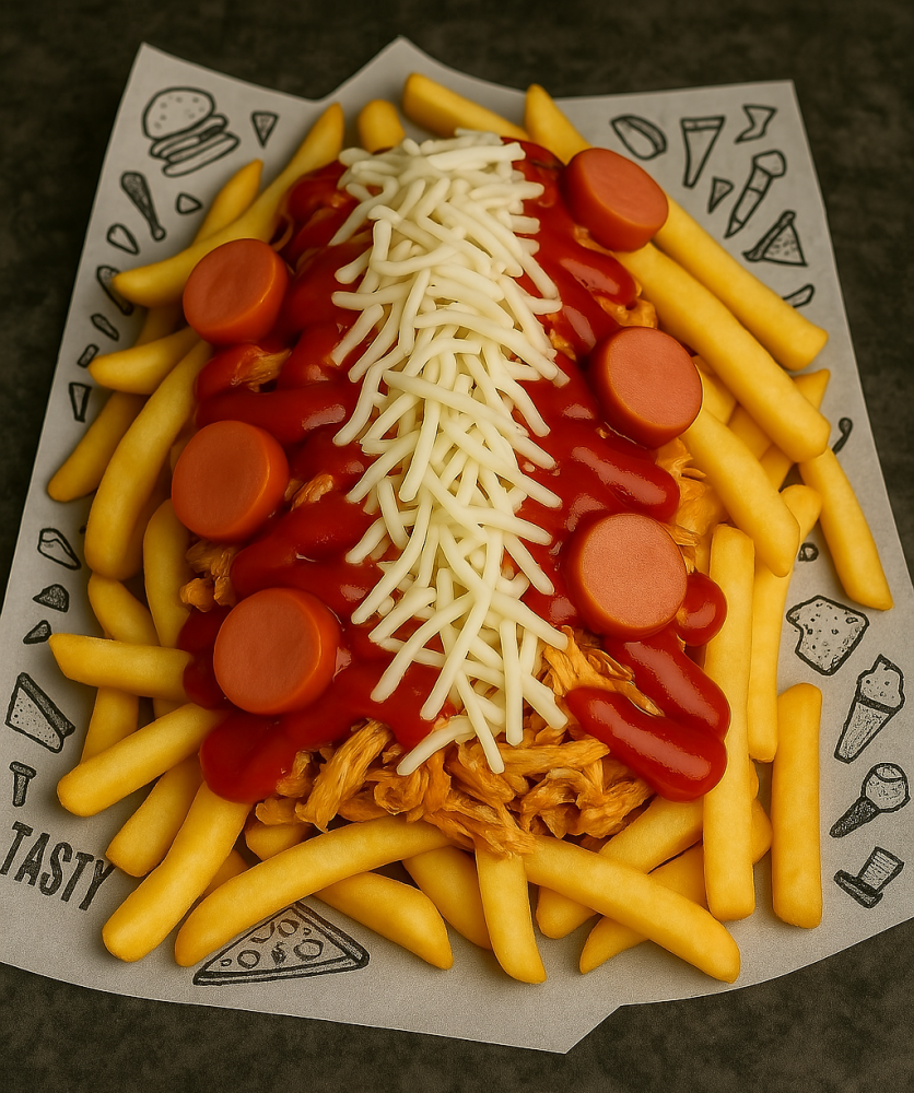 Batatas fritas com frango desfiado, salchicha, queijo ralado e nosso molho especial caseiro.