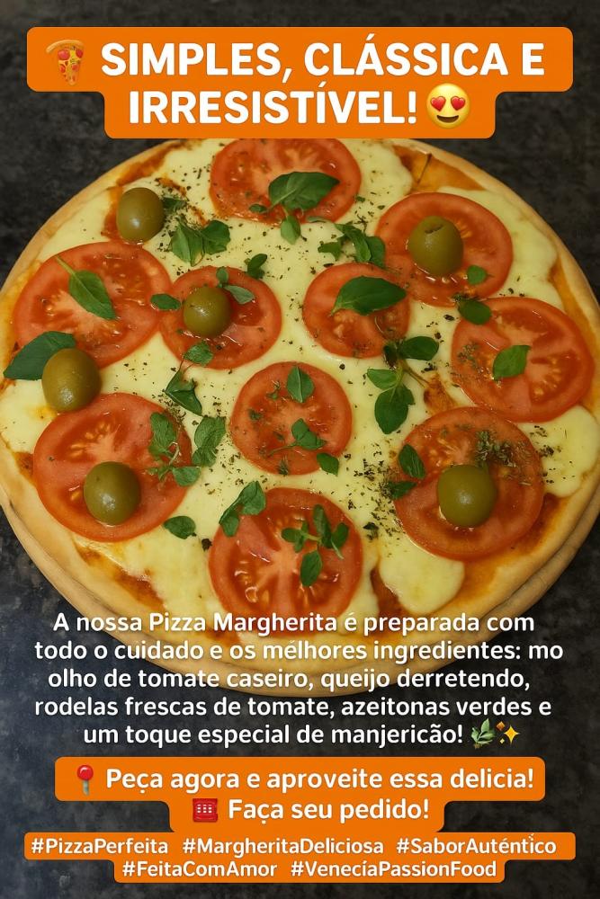 Molho caseiro, queijo mussarela derretido, tomate fresco, manjericão fresco, azeitonas e orégano.