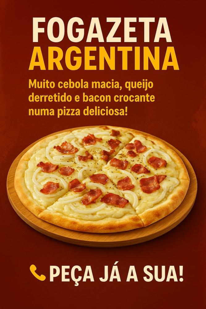 Molho branco caseiro, queijo mussarela, bacon defumado, cebola e orégano, uma pizza argentina clássica.
